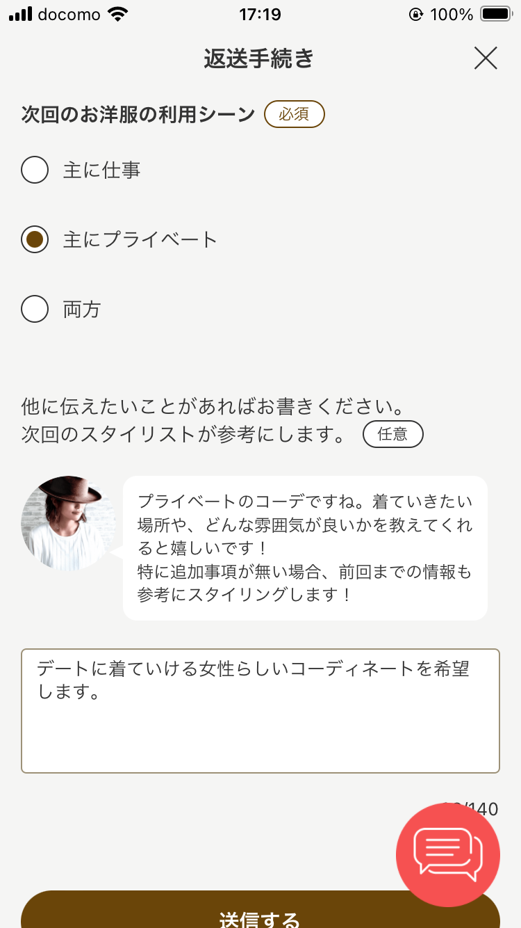 返送手続きの際に、次回のコーディネートにおけるリクエストをお伝えいただけます。