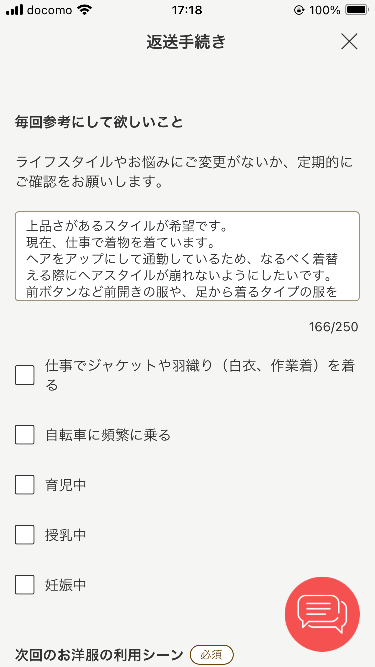返送手続きの際に、毎回のスタイリングの際に参考にして欲しい内容(好きな芸能人、よく着るお洋服のブランド、身体的なお悩み、ライフスタイル情報など)をお伝えいただけます。