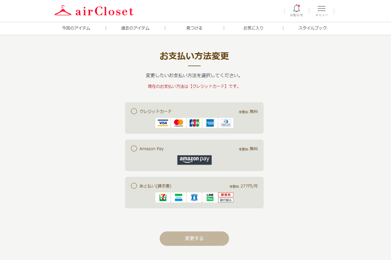 お支払い方法の変更をご希望する際は、こちらより、各支払い方法にてご選択ください。1ヶ月コースの場合:クレジットカード・Amazon Pay・後払いに変更可能3・6・12ヶ月コースの場合:クレジットカード・Amazon Payのみ変更可能変更手順WEBサイトホーム内の「メニュー」>「会員情報の確認・変更」を押下 > お支払い方法変更 アプリホーム下部の「その他」>お支払い情報セキュリティの関係上、現在登録されているクレジットカードの番号を確認することができません。詳細はお客様サポートへお問い合わせください。