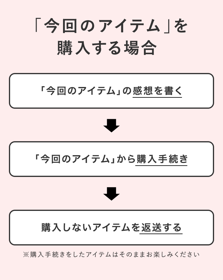 現在、お届けされているアイテム一覧の中から、お気に入りのアイテムを購入できます。ご購入手続きされたアイテムは、そのままお客様のお洋服としてお楽しみいただくことができ、ご返送も不要です。