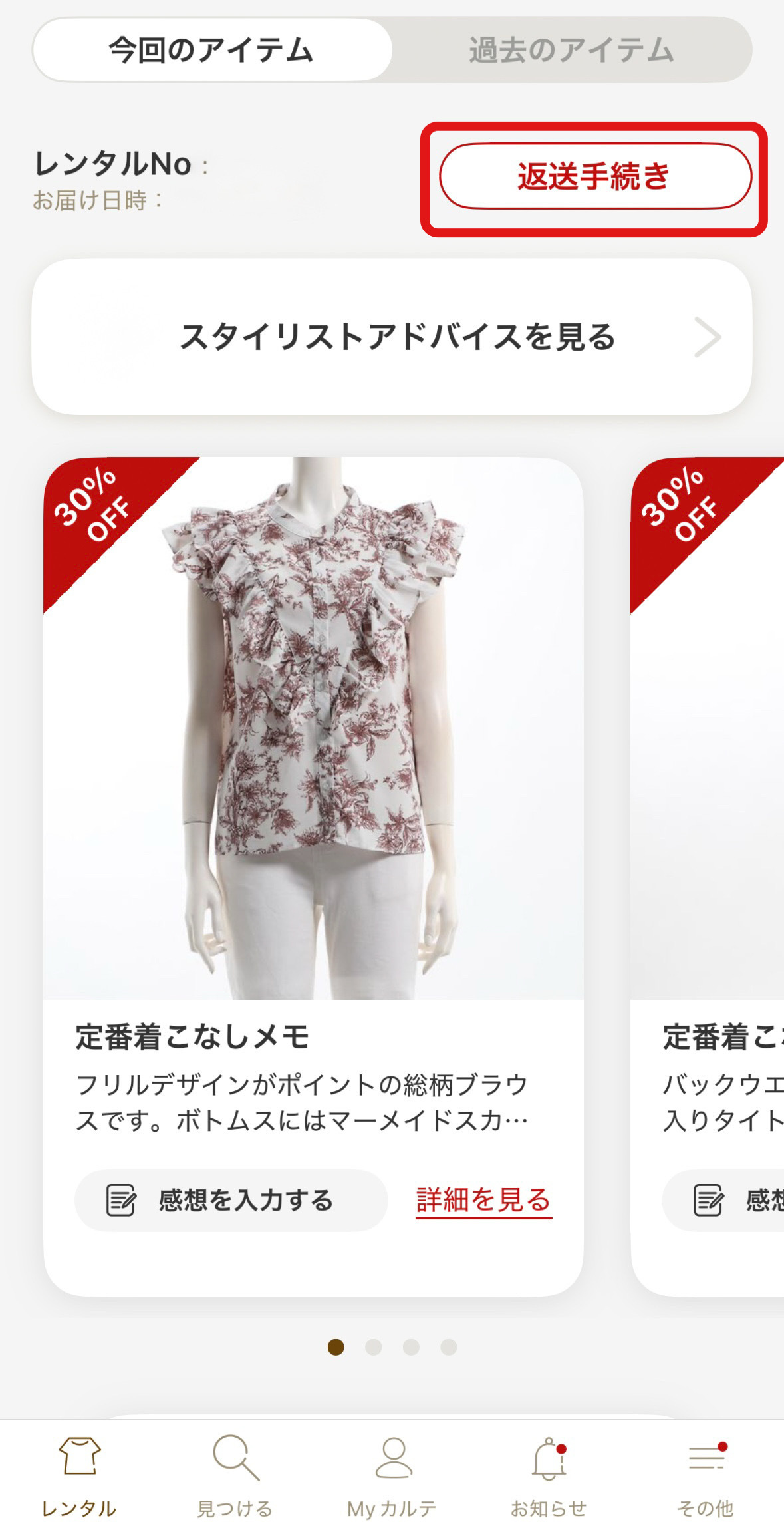 3.「今回のアイテム」の画面右上にある【返送手続き】を押してください。