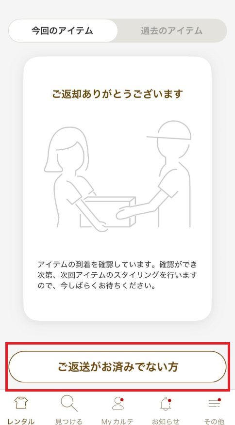 返送手続き後に【返送を完了する】を押下し忘れた場合でも、弊社倉庫にて返却確認が正常に確認でき次第、新しいコーディネートの手配が行われます。