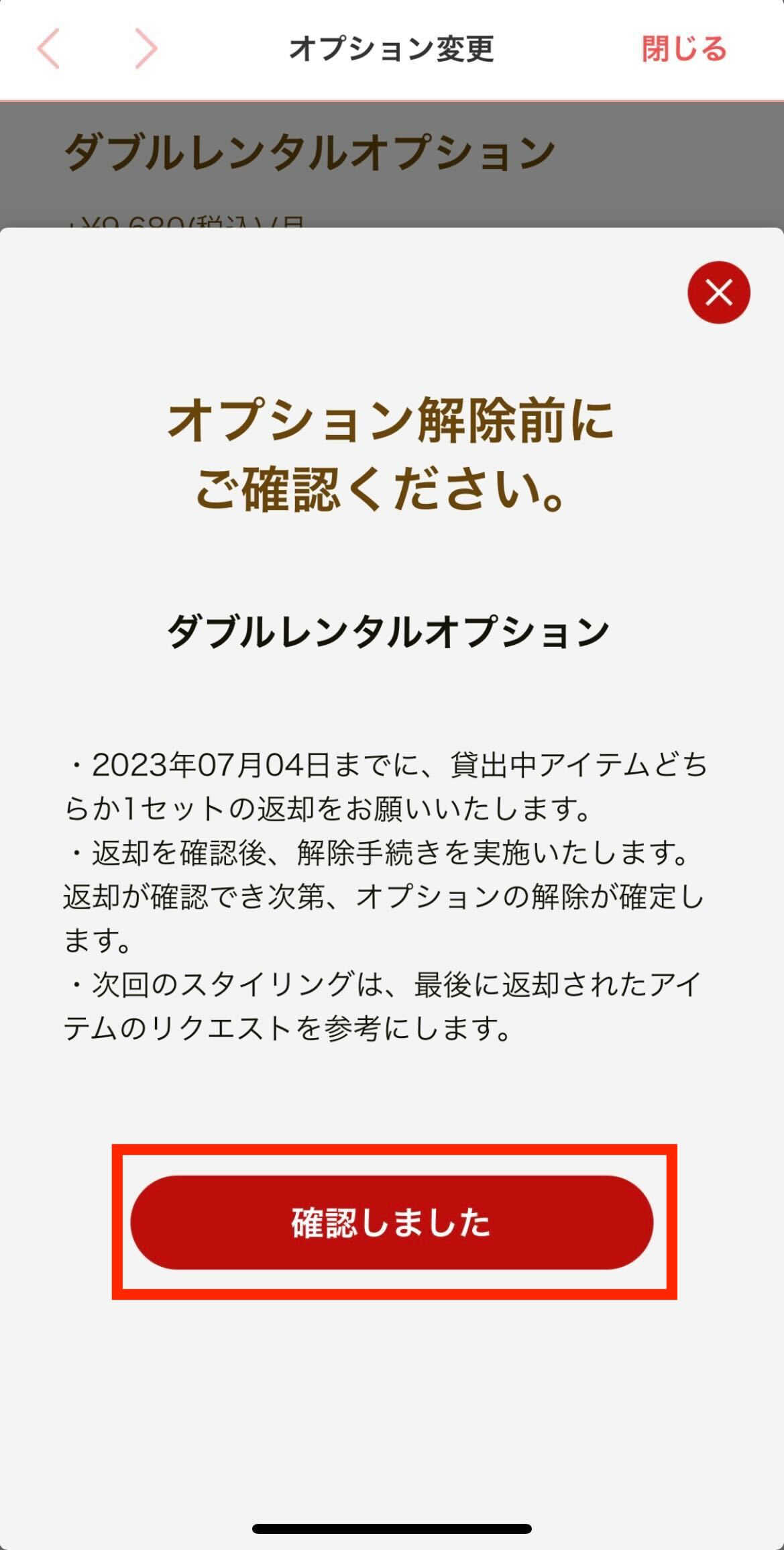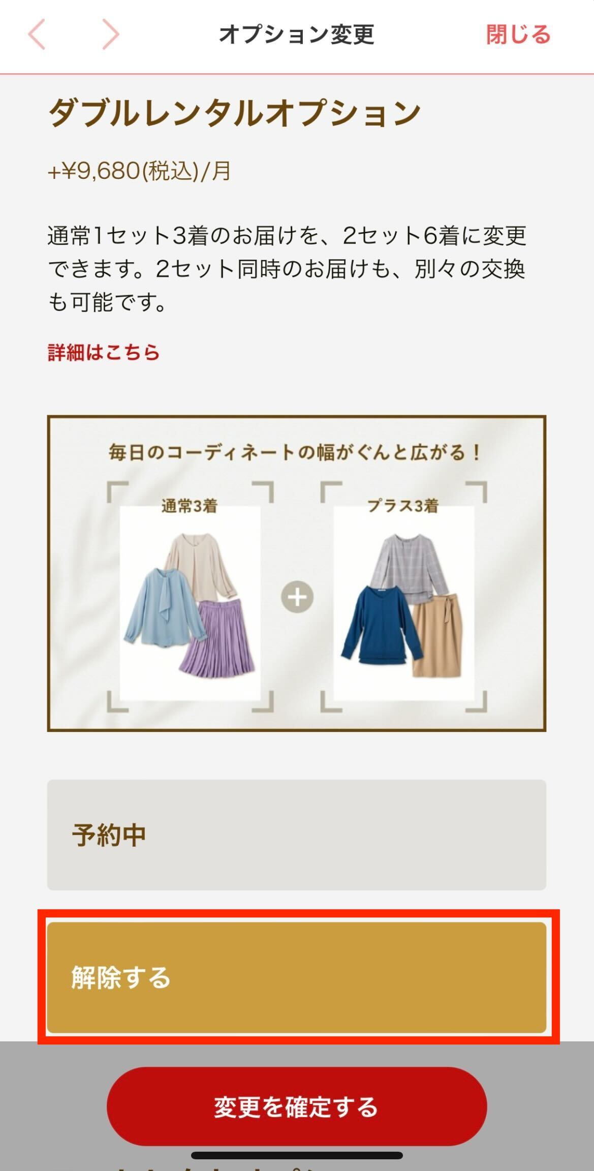 弊社にてアイテム1セットの返却確認を行いまして 『件名:【airCloset】オプション解除確定のお知らせ』メールの到着を持ちまして解除確定となります。