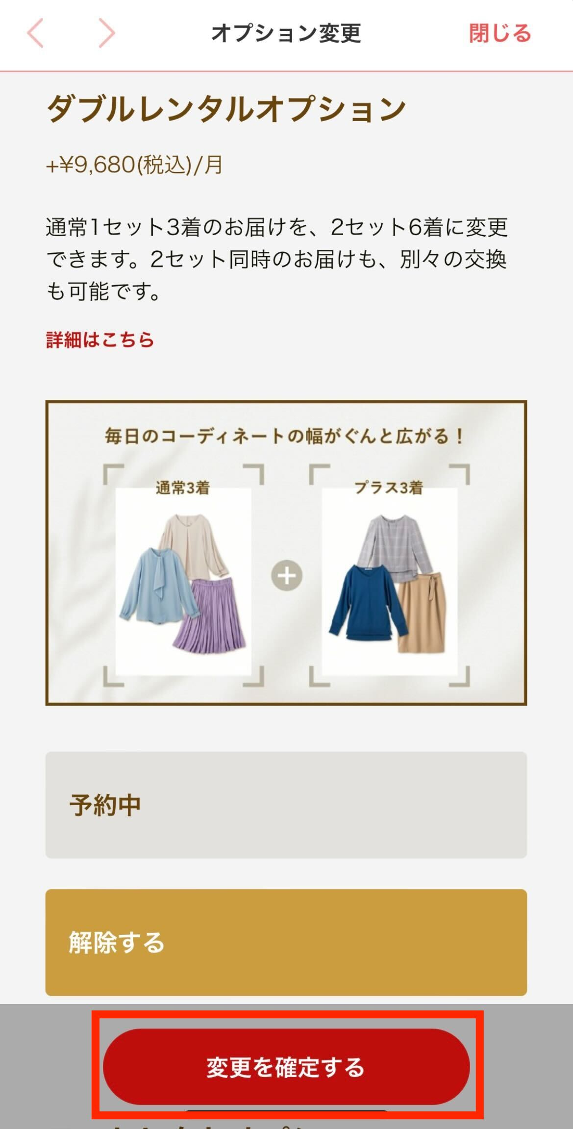 ダブルレンタルオプションを選択すると、通常「1回3着」でご提供しているコーディネートを「2回6着」をレンタルできるようになります。詳しくはこちらをご参考ください。