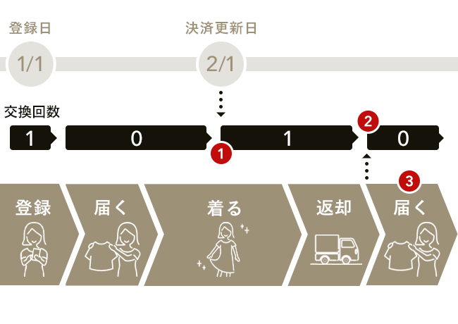 ご登録から1ヶ月が経過したタイミング(決済更新日)で交換回数が付与され、コーディネートのスタイリング開始時に自動で使用される