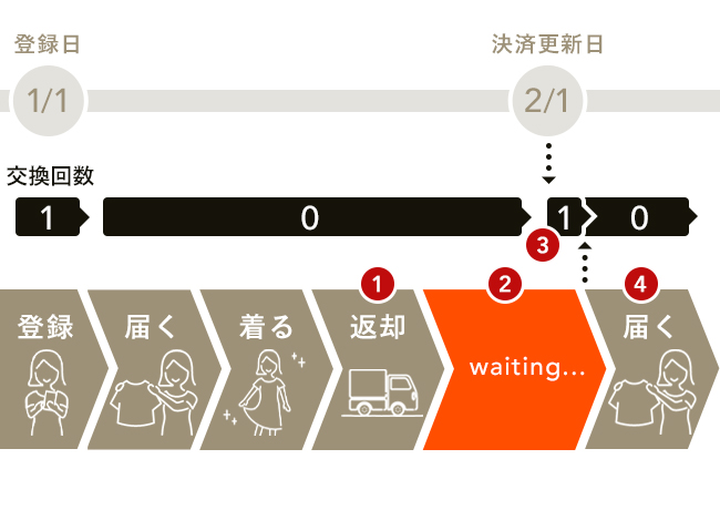 早めにお洋服を返却してしまった場合、次の交換回数の付与までお洋服をお届けできない期間が発生します。ご注意ください。