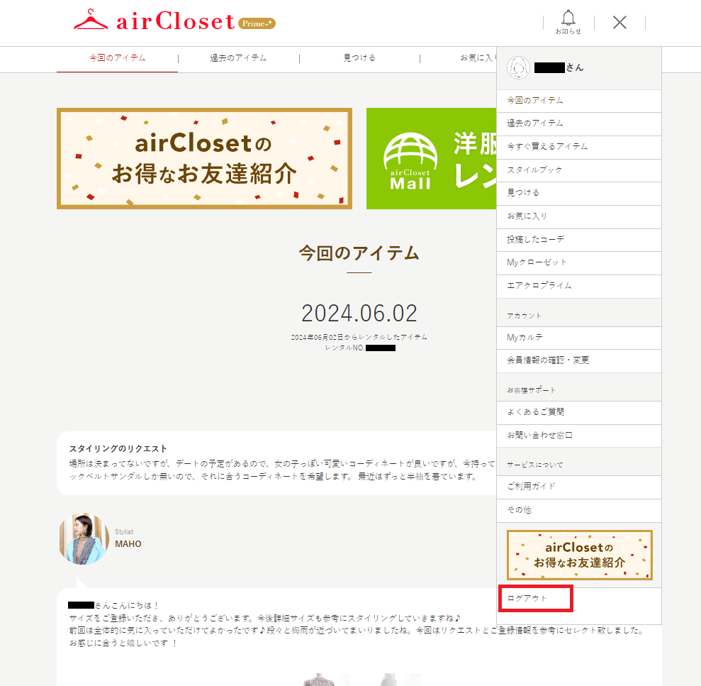 ウェブサイト:ホーム内のメニュー > メニュー最下部のログアウトを押下