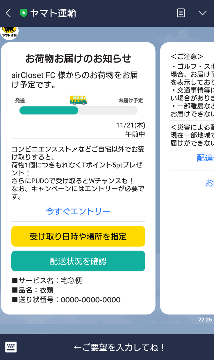 ヤマト運輸が提供するクロネコメンバーズへのご登録をおすすめします。荷物が発送されたらメールやLINEで通知が届き、受け取り日時や場所の変更、再配達依頼などが簡単に行えます。