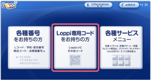 Loppiメニューの「Loppi専用コードをお持ちの方」を押してください。