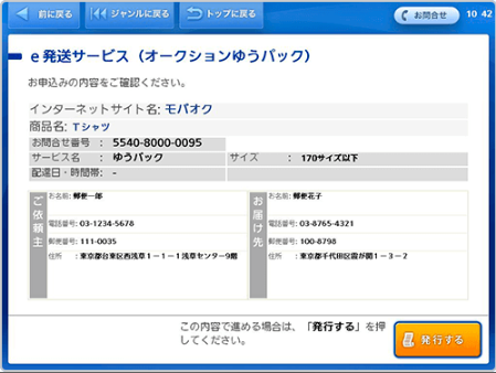 .画面上のお届け先などの情報を確認し、右下の「発行する」ボタンを押してください。