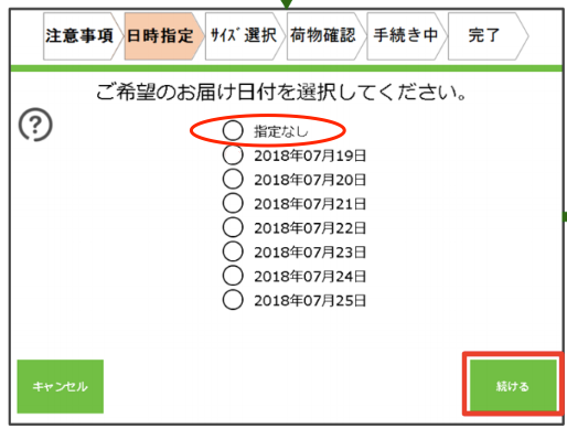 お届け時間帯も「指定なし」を選択し「続ける」をタッチ。
