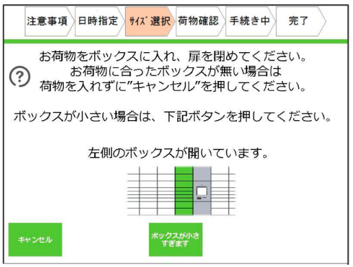 なお、指定したロッカーが小さく荷物が預けられない場合は、「ボックスが小さすぎます」のボタンをタッチし、ボックスのサイズを再度選んでください