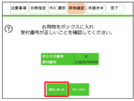 荷物の受付番号を確認して、「確認しました」をタッチしてください。
