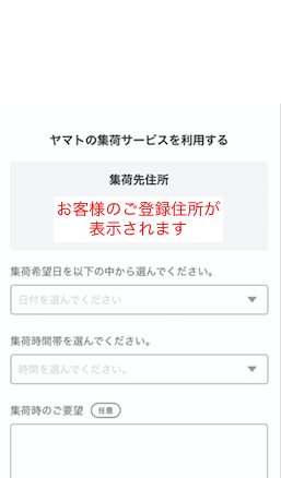 集荷先のご住所に間違いがないかご確認の上、集荷の希望日と時間帯を選択してください。