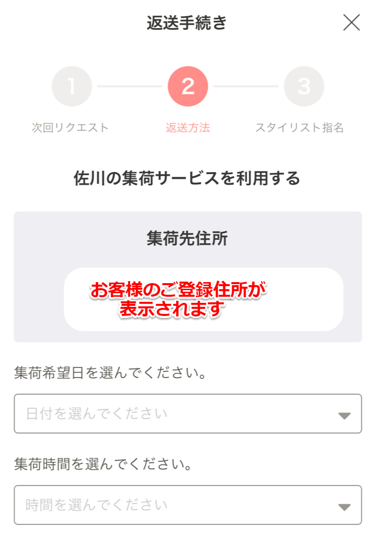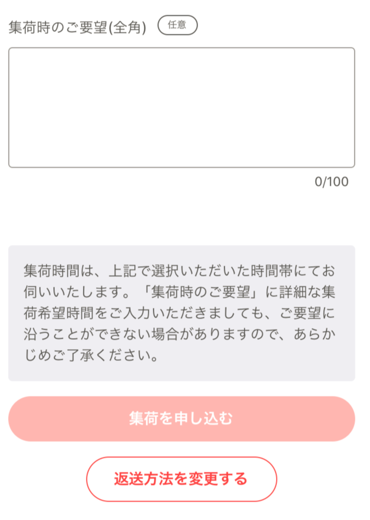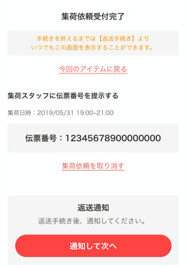 1.アプリやWebサイトの「今回のアイテムページ」の返送手続きにおいて「集荷」を選択