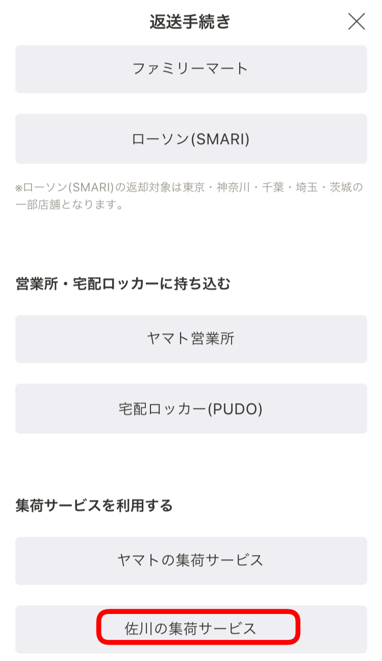 「今回のアイテム」の「返送手続き」より「佐川の集荷サービス」を選択してください。
