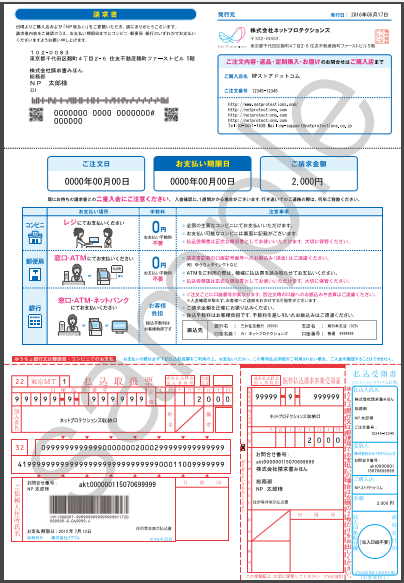請求書に記載のお支払い期限日までに、下記の方法でコンビニ、郵便局、または銀行にてお支払いください。