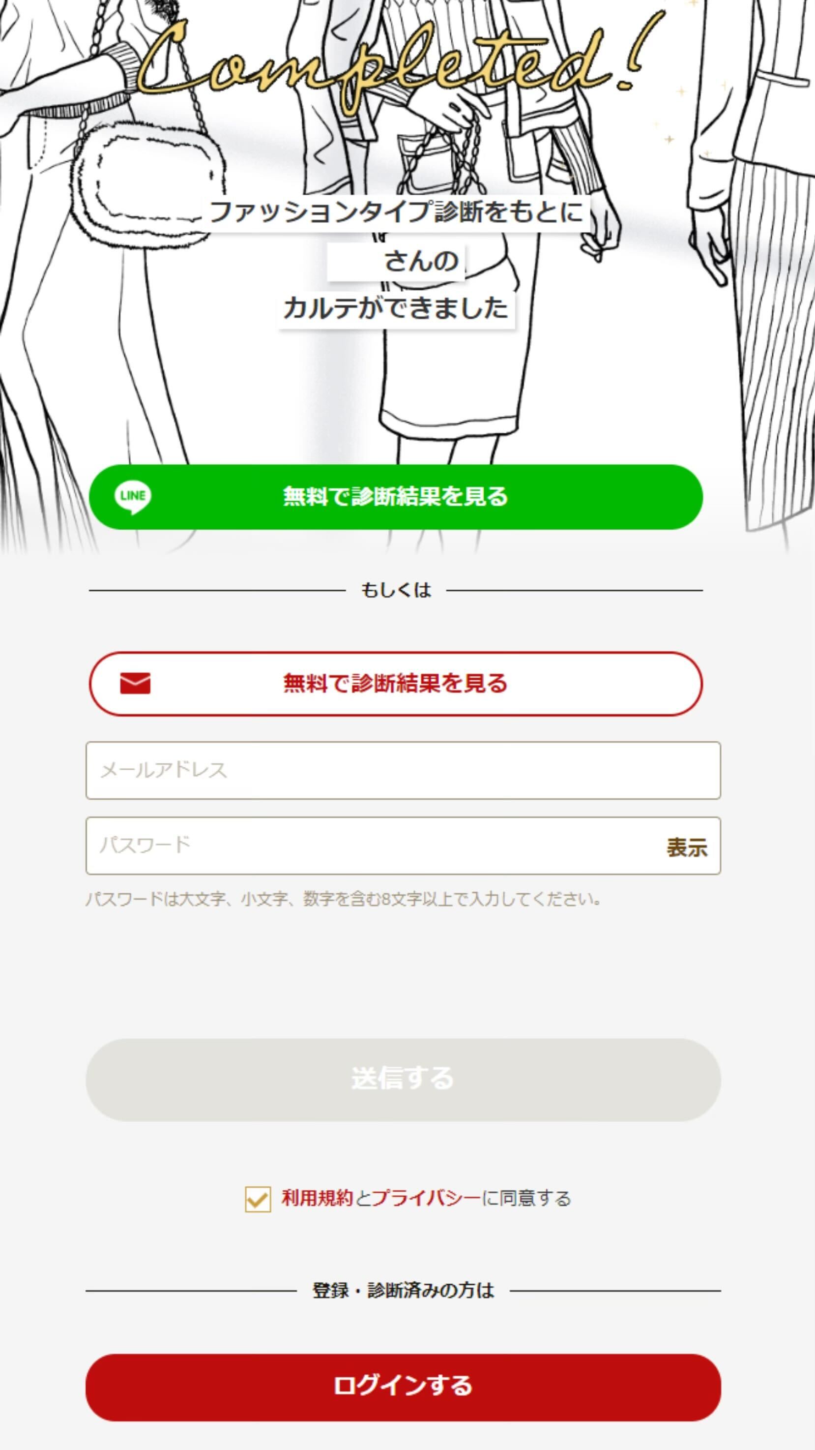 メールアドレス・パスワードを設定した上で、「送信する」をクリックしたらご登録完了です。