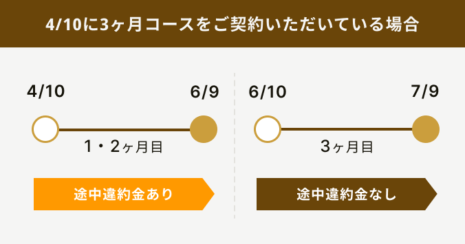 (例:3ヶ月コースを更新し再度3ヶ月コースの1ヶ月目(4ヶ月目)で解約→途中違約金は発生します)