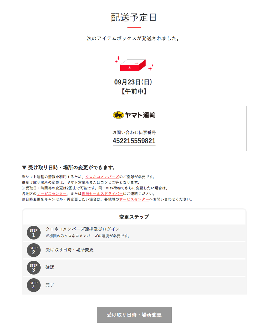 下記ページより【受取り日時・場所変更】ボタンをクリックし、ご希望の受取り場所・日時をご変更ください。
